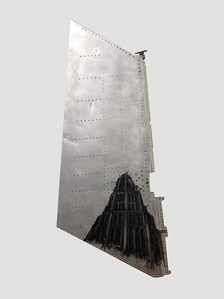 Déclinée sur des cartes géographiques ou des couvertures d’ouvrages anciens, la pratique de Sébastien Champion interroge tout autant la matière et le support que le rapport à l’image par le prisme d’un mythe fondateur de la Genèse, la tour de Babel.
